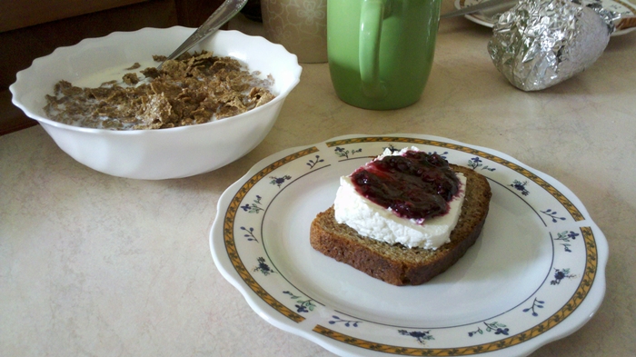 Kanapka z twarogiem półtłustym i dżemem jeżynowym, płatki Bran Flakes z twarogiem i mlekiem, jabłko (wcześniej)
